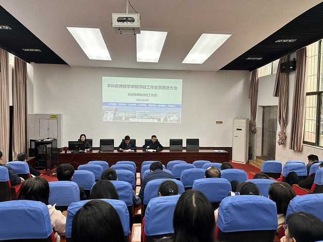 2024年4月9日下午2:00,学院在报告厅召开本科教育教学审核评估作全员推进大会。学院党委书记刘庆言、副院长卢丽敏、副院长龚霞、学生党总支书记彭玉萌、教研室主任及全体教工老师参加会议。会议由龚霞副院长主持。