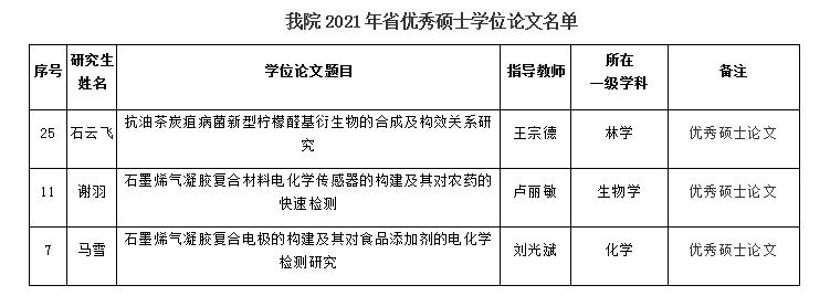近日,江西省学位办公布了2021年全省优秀博士硕士论文入选名单,金沙官网王宗德教授、卢丽敏教授、刘光斌副研究员分别指导的研究生石云飞同学、谢羽同学、马雪同学的学位论文入选为江西省优秀硕士学位论文。这充分体现了金沙官网注重研究生培养过程管理,加强研究生学位论文质量建设,切实保障了硕士学位论文质量。