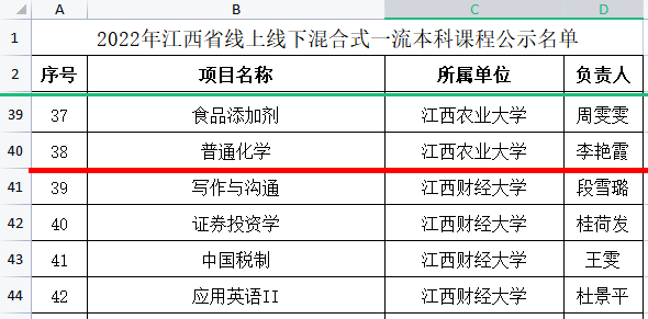 2023年初,根据《关于开展2022年江西省线上、线下、线上线下混合式、社会实践一流本科课程认定工作的通知》(赣教高字〔2022〕33号),经我校申报推荐,省教育厅组织专家评审,公布了2022年度江西省一流本科课程名单,化材院3门课程被认定为江西省一流课程,其中,龚霞老师的通识课“生活中的趣味化学”和吴东平老师的专业课“现代仪器分析”被认定为江西省线上一流本科课程,李艳霞老师的公共基础课“普通化学”被认定为江西省线上线下混合式一流本科课程。