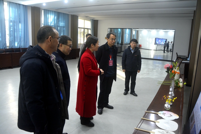 孙振东一行首先实地查看了办公楼前“方寸园”小广场和学生文化交流中心内展示的团扇等其他劳动教育成果作品,详细了解了学院在劳动教育工作上取得的成效。随后,孙振东分别深入各实验室与教学档案室,认真听取实验教学开展的情况,翻阅教案、毕业论文设计、试卷及成绩单等资料。