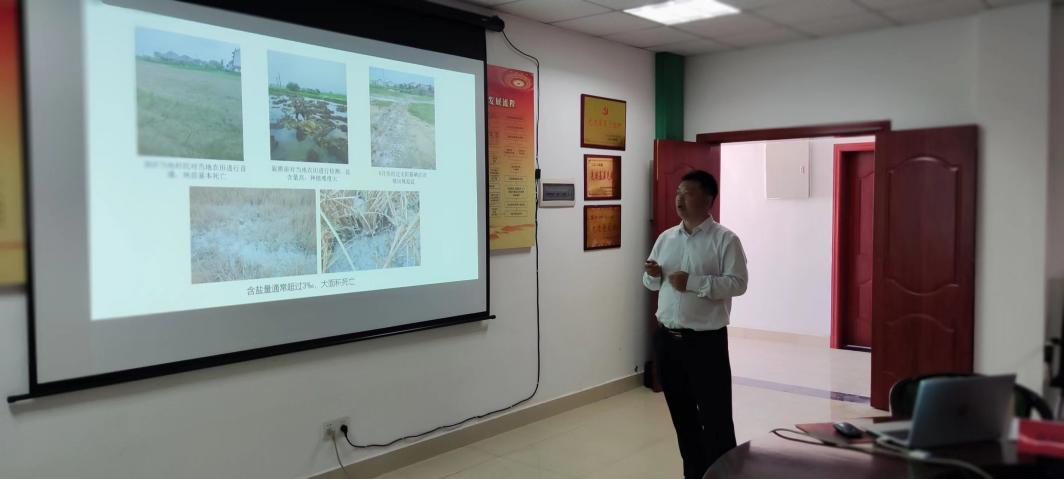 6165cc金沙总站副校长、江西省作物学会理事长贺浩华教授主持会议,6165cc金沙总站青年教授文阳平博士对江西省耐盐水稻新品种筛选和土壤改良技术示范项目进行汇报,该项目自2022年5月开始实施了耐盐水稻新品种筛选和土壤改良技术示范,开展了15个水稻新品种筛选实验,品种间耐盐表现差异明显。集中连片种植115亩“香禾优明月丝苗”品种,土壤含盐量本底值5‰-8.5‰通过应用土壤调理等多重降盐集成改良技术,水稻生长基本正常,无倒伏和明显病虫害。随机选取一块田,现场实割633.4 m2,收湿谷463.1 kg,折合亩产487.5 kg,扣除杂质和水分,干谷产量每亩419.2 kg。该项目的实施对南方盐渍化土壤改良及其耐盐水稻品种种植提供科学依据。