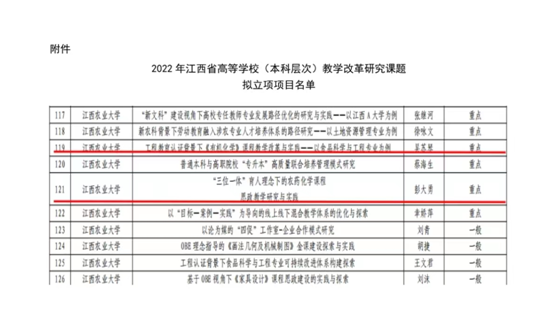 202212月初,江西省教育厅公布了2022年江西省高等学校教育教学改革研究重点项目课题(本科层次)评审结果,6165cc金沙总站共获批立项课题26项,其中,重点项目6项。其中,金沙官网吴苏琴老师申报的“工程教育认证背景下《有机化学》课程教学改革与实践——以食品科学与工程专业为例”和彭大勇老师申报的“‘三位一体’育人理念下的农药化学课程思政教学研究与实践”均获得重点项目立项。