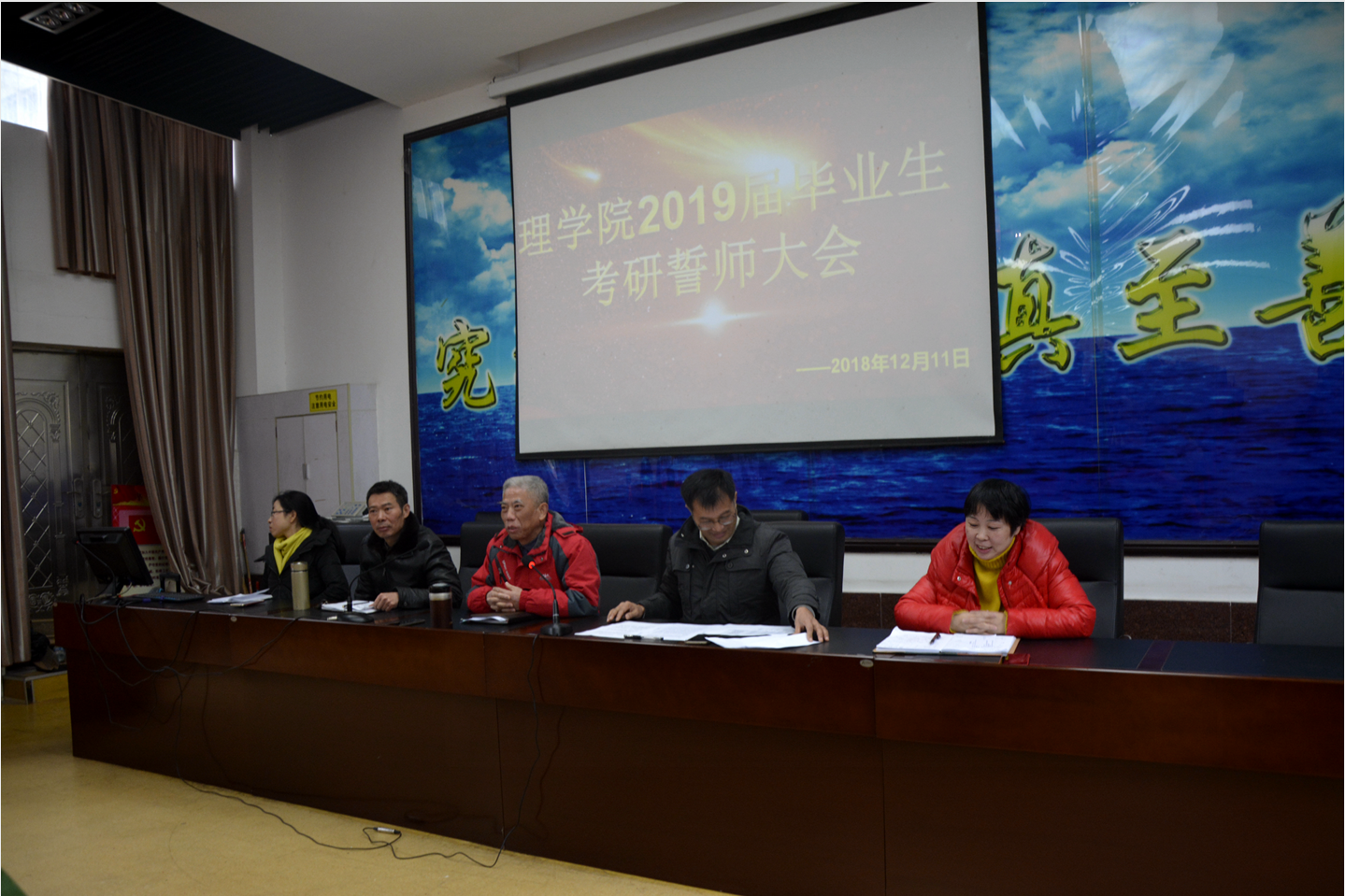 为浓厚考研氛围,强化学院对考研工作的指导,12月11日,理学院召开2015级报名参加2019年硕士研究生入学考试的考前动员大会,理学院党委书记周阳、院长王义华、副院长黄长干、毕业班班主任及2019届毕业生考研代表共计70余人参会,会议由周阳主持。