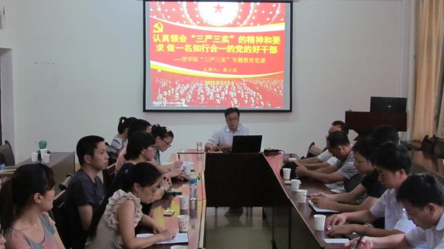 彭小波书记以《认真领会“三严三实”的精神和要求,做一名知行合一的党的好干部》为题讲授专题党课,并传达校党委曹书记在中心组学习会上的讲话精神和报告的主要内容,引导全院教职工党员学习贯彻“三严三实”的精神和要求。彭书记的党课内容分为三个部分,即一是介绍“三严三实”提出的历史背景和时代精神;二是在行动上如何落实“知行合一”;三是从六个方面初步查摆工作中存在的“不严不实”问题,即学院办学及发展定位问题、教育教学质量问题、科研平台建设问题、人才引进与培养问题、学科建设问题及党建工作创新问题,并且分别提出了解决问题的办法和要达到的预期目标。