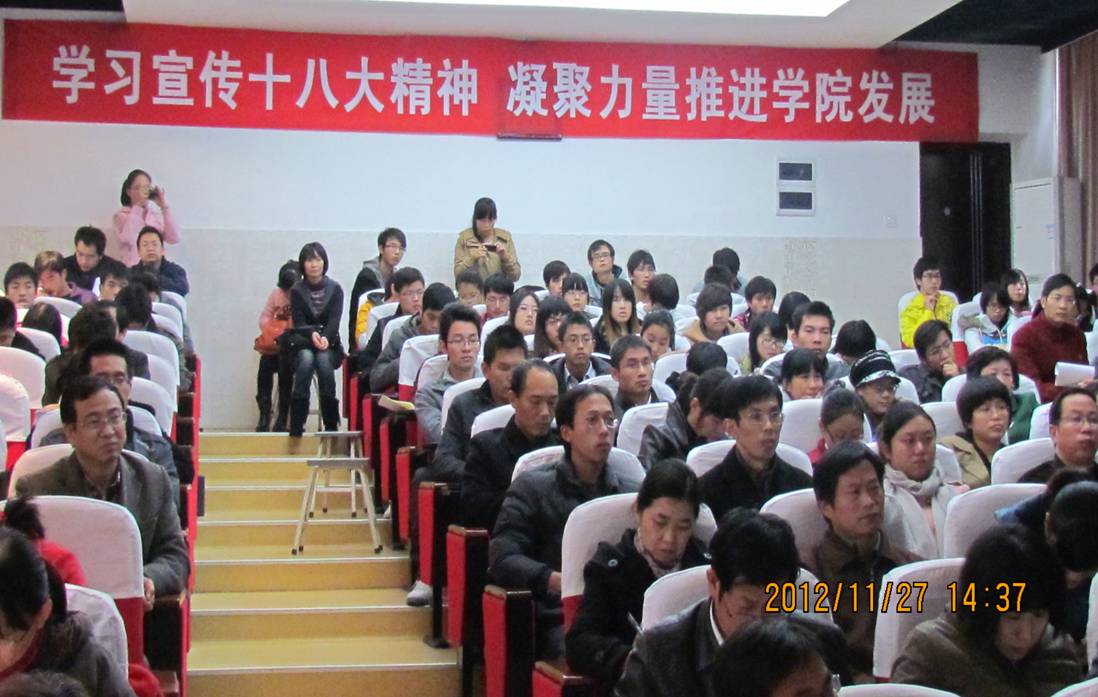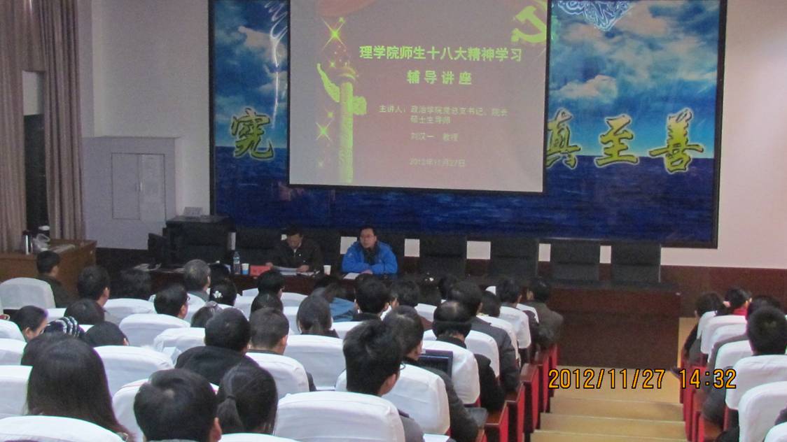 为了切实领会党的十八大精神,掀起学习宣传贯彻十八大精神的热潮,激发全院师生员工的学习工作热情,推进金沙官网工作的科学发展,11月27日下午,学院特邀我校政治学院党总支书记、院长刘汉一教授作专题学习辅导讲座,讲座主题为《十八大报告的新思想、新观点、新论断》,由党委书记彭小波主持。全院120多名师生聆听了讲座内容。