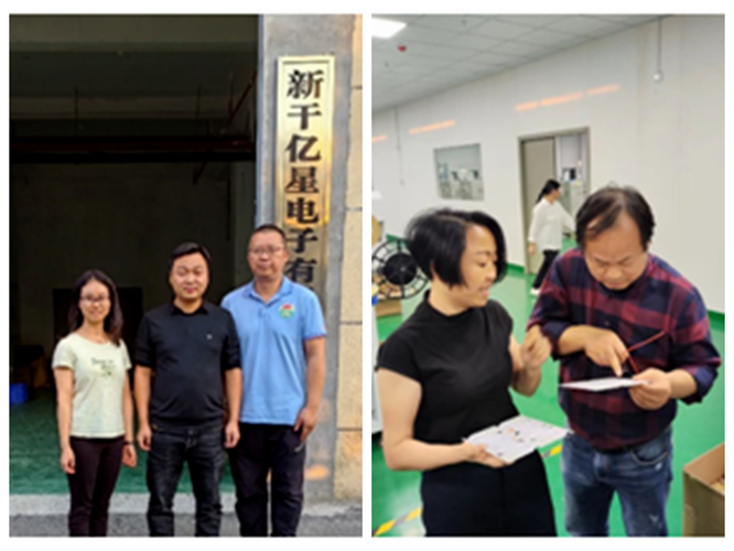 2023 1015日,为加强校企合作、推进“百博百企”项目进展,化学系支部党员贺雪梅博士和研究生支部党员黄喜根教授以及黄建平教副授到新干县亿星电子科技有限公司进行调研,总经理刘清辉介绍了目前的生产销售情况,李主管陪同到车间调研并介绍了生产技术难点,双方就如何加强合作,解决公司生产难题等问题形成了一致认识。