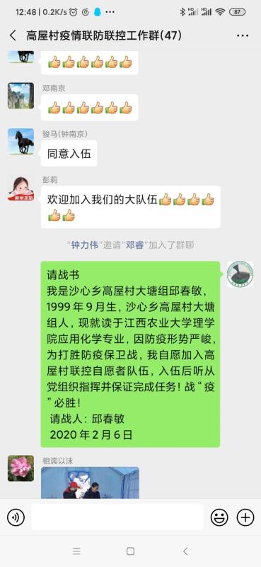 “我是沙心乡高屋村大塘组邱春敏,19999月生,沙心乡高屋村大塘组人,现就读于6165cc金沙总站理学院应用化学专业,因防疫形势严峻,为打胜防疫保卫战,我志愿加入高屋村联控志愿者队伍,听从党组织指挥并保证完成任务。”这是我校应化1702班的邱春敏同学用微信赣州市于都县沙心乡高屋村村干部发出的请战申请书。疫情来袭,村里建立联防联控工作组急需青年志愿者,邱春敏第一时间请战,在村干部的带领下工作在联防联控一线,主要负责疫情排查、防控宣传及守卡工作。