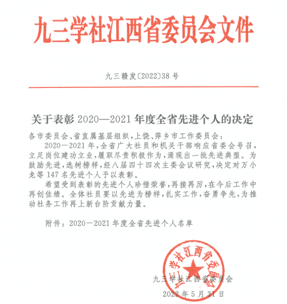 近日,九三学社江西省委印发《关于表彰2020-2021年度全省先进个人的决定》,金沙官网龚霞老师被授予2020-2021年度“全省优秀个人”荣誉称号,龚霞老师也是我校本次唯一获此殊荣的老师。