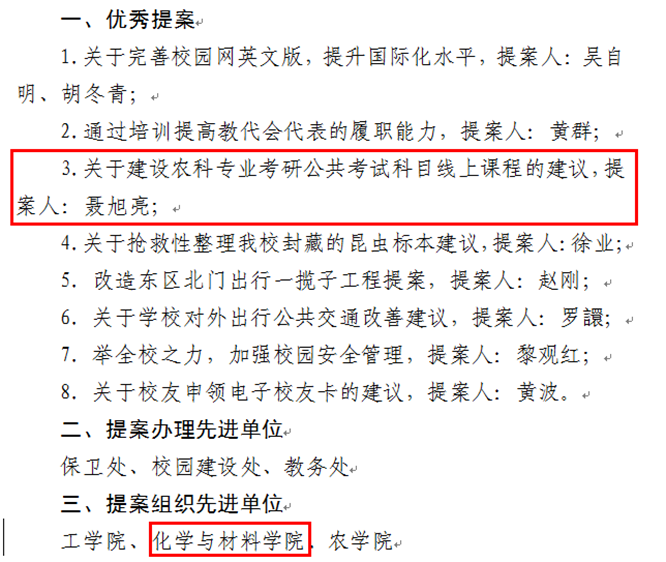金沙官网党政领导历年来都非常重视“双代会”提案工作,要求每位“双代会”的代表们至少提出一个提案,要求“双代会”的代表们以高度的主人翁意识,充分行使职权,切实履行职责,深入调查研究,广泛征求意见,就学校发展重大问题和涉及师生切身利益的实际问题积极建言献策,助推学校事业健康持续发展。2023年金沙官网“双代会”代表们共提交7份优质提案,聂旭亮代表提出的“关于建设农科专业考研公共考试科目线上课程的提案”的提案获评优秀提案,学院分工会获评提案组织先进单位。
