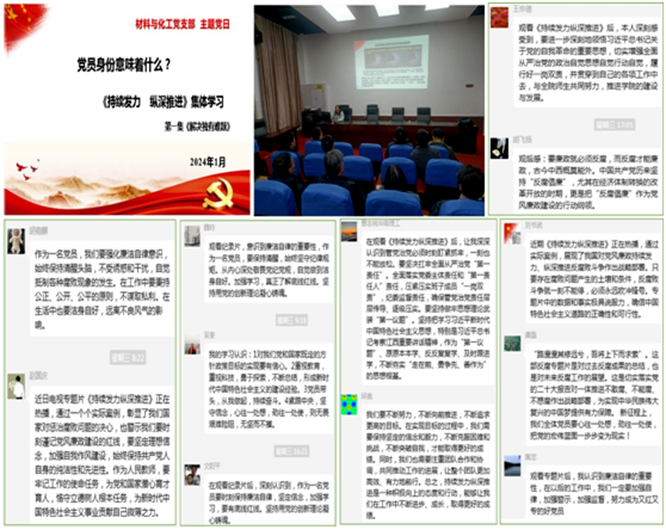 2024年1月11~13日,材料与化工支部持续开展了《政治监督保障》、《强化正风肃纪》、《一体推进“三不腐”》的线上自学活动,党员们积极观看,并在微信群发表了自己的观后感。通过这次“线上线下混合式”的主题党日活动,材料与化工支部的党员们坚定了廉洁自律、纵深推进反腐败争的意识,明确了党员身份的重担,期待以此推进工作高质量发展、取得新进展新成效。