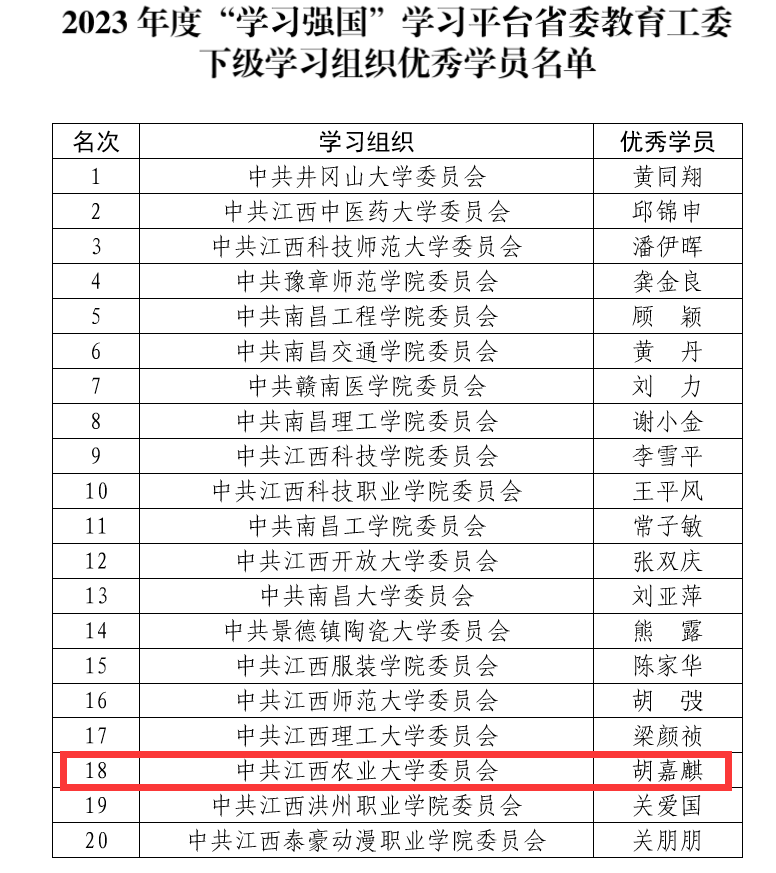 日前,中共江西省委教育工委发文公布了2023年度“学习强国”学习平台省委教育工委下级优秀学员、优秀供稿单位和优秀供稿员评选结果,材料与化工系教工党支部党员胡嘉麒同志作为学校唯一代表获评2023年度“学习强国”学习平台省委教育工委下级学习组织优秀学员。