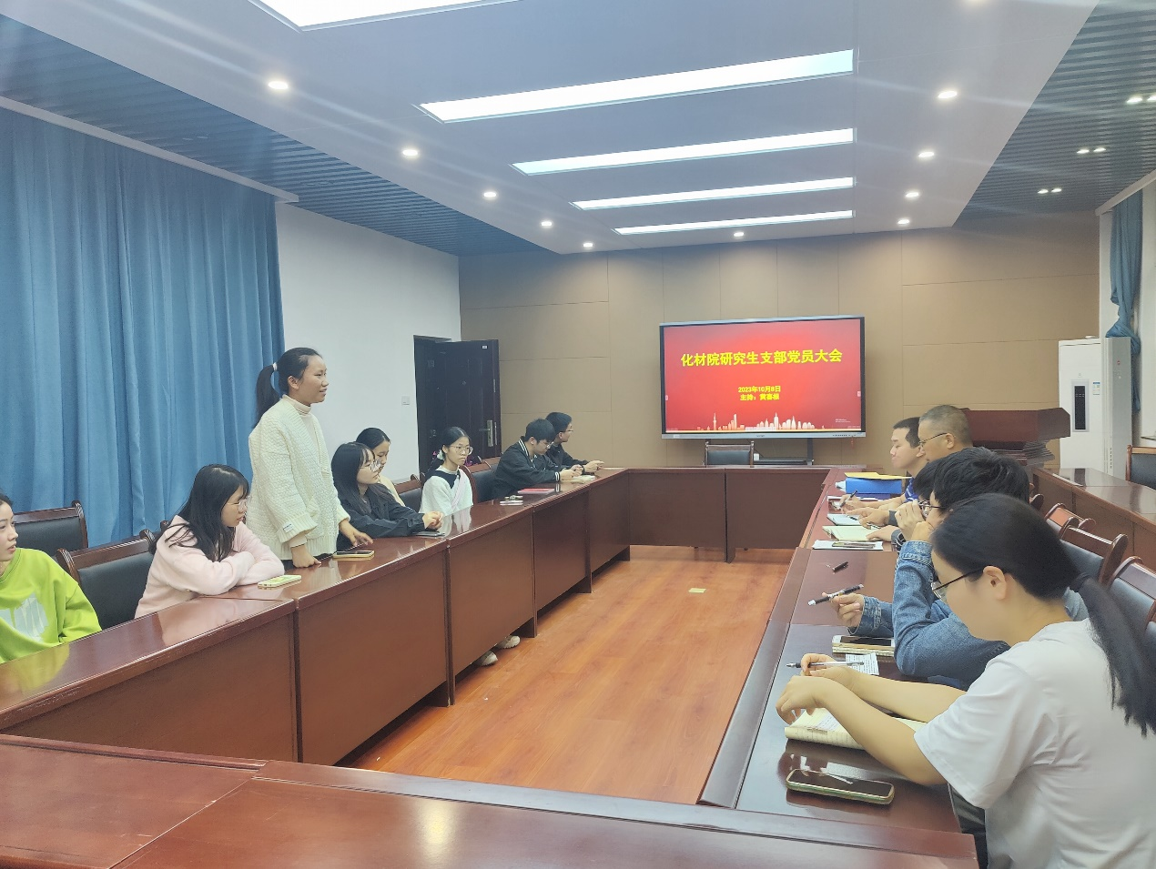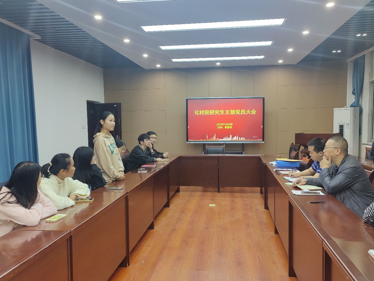 2023年10月8日,研究生党支部在致理楼214召开支部党员大会,集体学习并讨论发展对象人选,此次会议有党员13名,列席6人,共19人参会,会议由党支部书记黄喜根老师主持。