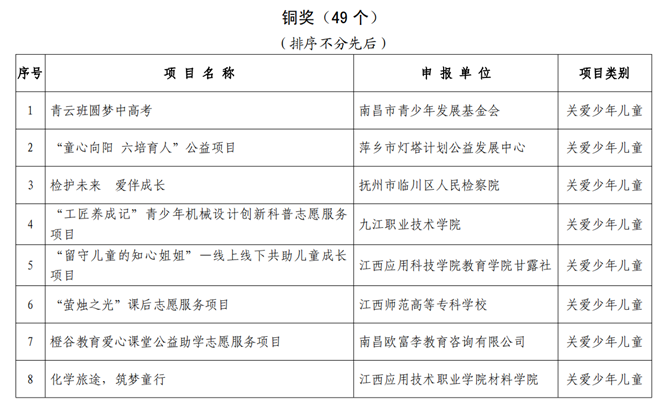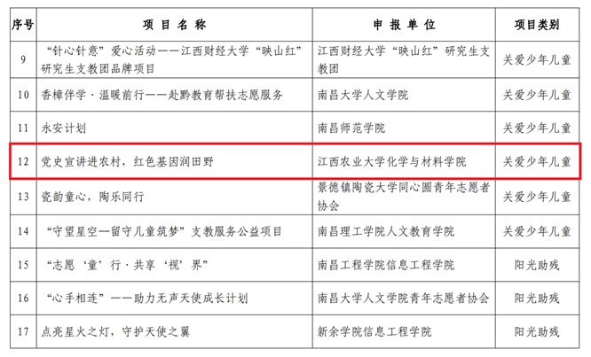 2024年5月23日,共青团江西省委公布了第四届江西省青年志愿服务项目大赛获评名单,金沙官网“党史宣讲进农村,红色基因润田野”关爱少年儿童志愿服务项目经过校级遴选、省级初赛、决赛答辩等多个环节,最终荣获江西省铜奖。