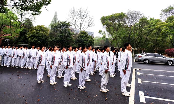 在惟义楼广场上,国旗护卫队迈着整齐铿锵的步伐将五星红旗护送至升旗台,伴随着庄严的国歌,鲜艳的五星红旗冉冉升起,全体成员面向国旗肃立行注目礼,高唱国歌。