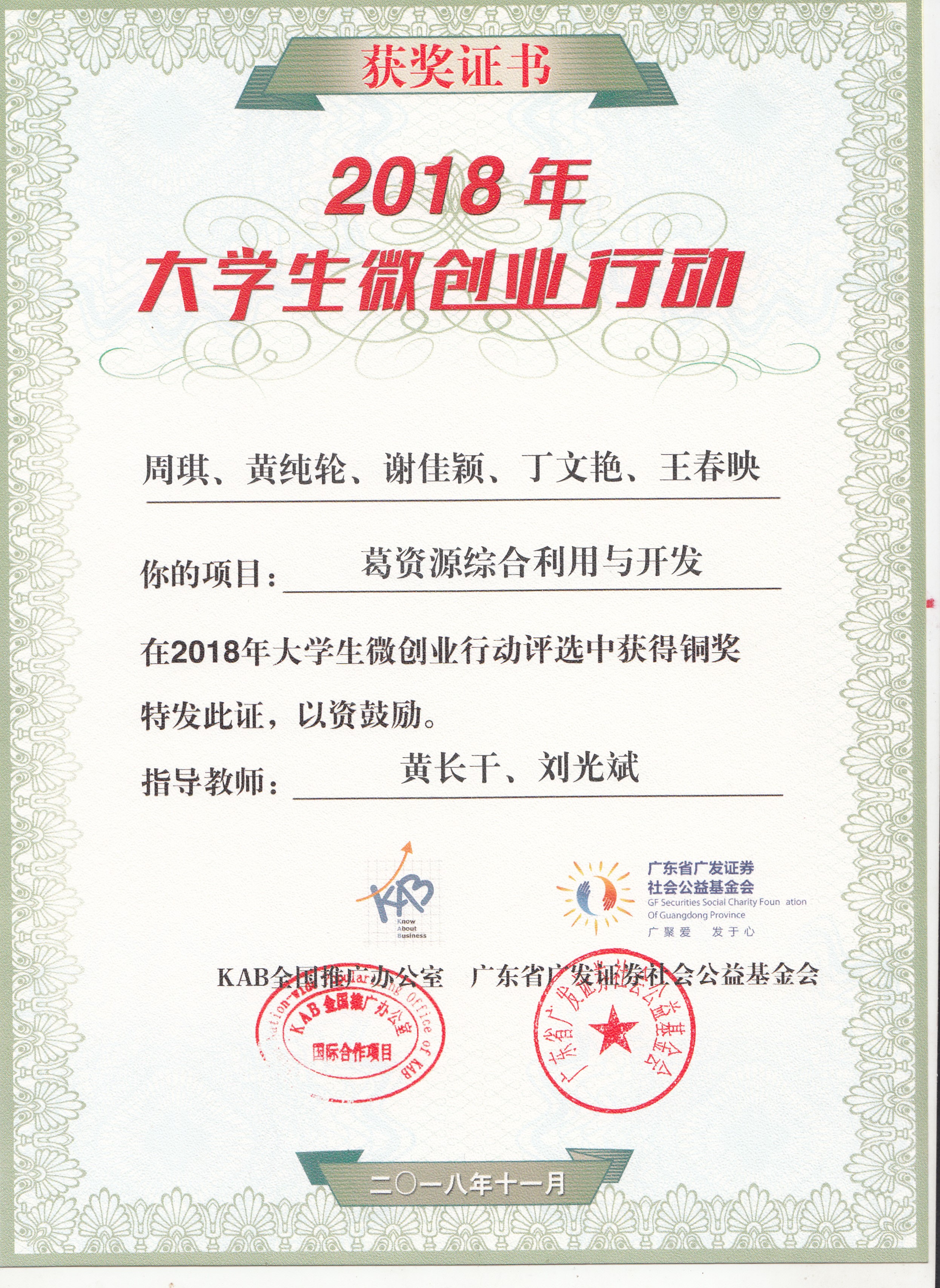 11月21日,由中国青年报社、KAB全国推广办公室及广发证券社会公益基金会等联合举办的“全国大学生微创业行动”成果发布会在中国人民大学落下帷幕。由金沙官网副院长黄长干教授指导,金沙官网学生周琪、黄纯轮、丁文艳、王春映参与申报的项目《葛资源综合利用与开发》获微创业项目铜奖,该项目也是江西省高校在此次大赛中的唯一获奖项目。
