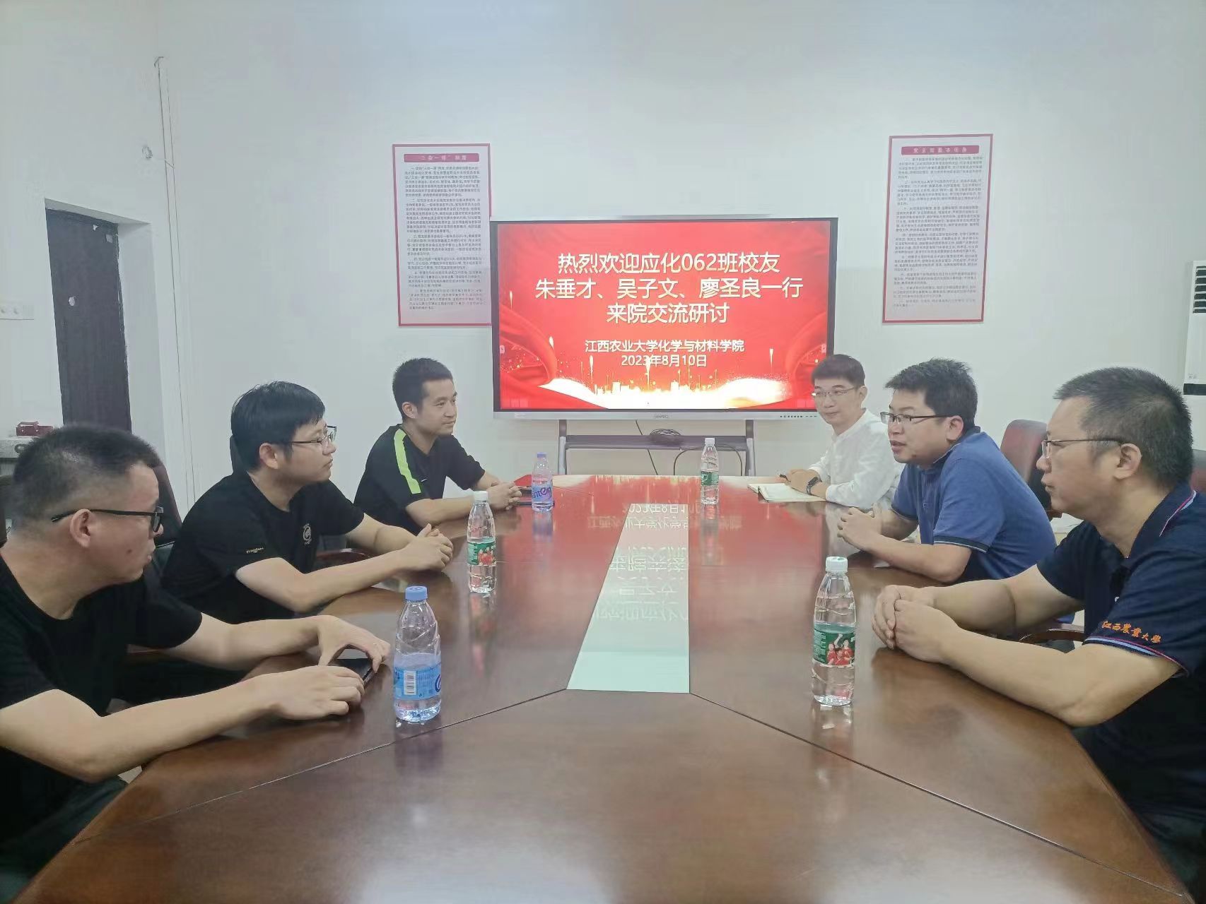 810日,应化062班校友美的集团总部区域经理朱垂才、青岛贞开生物医药技术有限公司经理吴子文、江西省农科院助理研究员袁丽娟、6165cc金沙总站林学院副研究员廖圣良等5位校友回学院开展交流。学院副院长卢丽敏、团委书记冷飞翔和办公室吴奎主任热情接见了5位校友。任课教师代表黄喜根、彭大勇等出席了交流会。交流会上,5位校友畅所欲言,感慨母校变迁,回忆校园时代往事,分享了毕业至今个人生活和工作的情况,同时就校友事务、双方交流合作进行了深入交流。学院领导及教师代表对校友们毕业之后所取得的成绩表示祝贺,祝愿校友们未来更美好欢迎校友们有时间常回母校母院交流