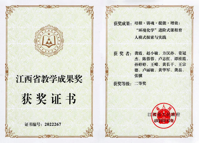 建设“金课”,突出教学相长实效。2018年以来,学院持续推进教育教学研究与实践,在课程建设、教材出版、项目立项、教学竞赛、教学成果、育人成效等方面呈持续上扬态势。一是建成省级课程10门,其中课程思政示范课程1门。课程包括江西省精品在线开放课程“环境化学”和“普通化学”、江西省线上一流课程“生活中的趣味化学”和“现代仪器分析”、江西省线上线下混合式一流课程“环境化学”“现代仪器分析”和“普通化学”、江西省高校育人共享计划课程“环境化学”、江西省研究生优质课程“高等环境化学”等10门。二是编写出版教材11部,获得教材奖3项。教材包括《普通化学》《有机化学》《分析化学》《物理化学》《仪器分析》《有机合成化学》《应用化学专业英语》《养殖水环境化学》等11部,获得全国农业教育优秀教材奖2项,江西省普通高等学校优秀教材二等奖1项。三是主持省级教研项目18项,其中重点项目6项。在教学内容创新、思政融合、科教融合、产教融合、教学模式创建、评价模式建设、等方面获得省级教研项目立项18项。四是荣获省级竞赛奖3项,省级教学成果奖1项。凝练教育教学研究成果,荣获第二届江西省教学创新大赛正高组二等奖、虚拟现实教学应用创新大赛一等奖、第五届江西省本科院校青年教师教学竞赛理科组三等奖;荣获江西省教学成果二等奖。五是指导本科生获得国家级/省级项目立项19项。教育教学研究成果用于教学实践,提升学生的科学创新思维和科学创新能力,学生获得互联网+大学生创新创业国家级项目10项、省级项目9项。