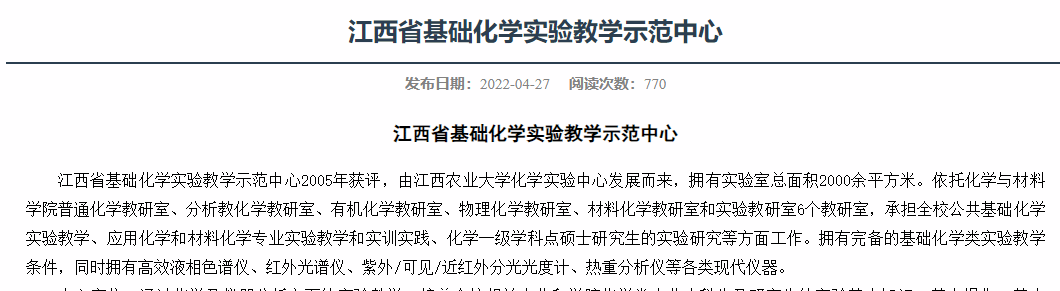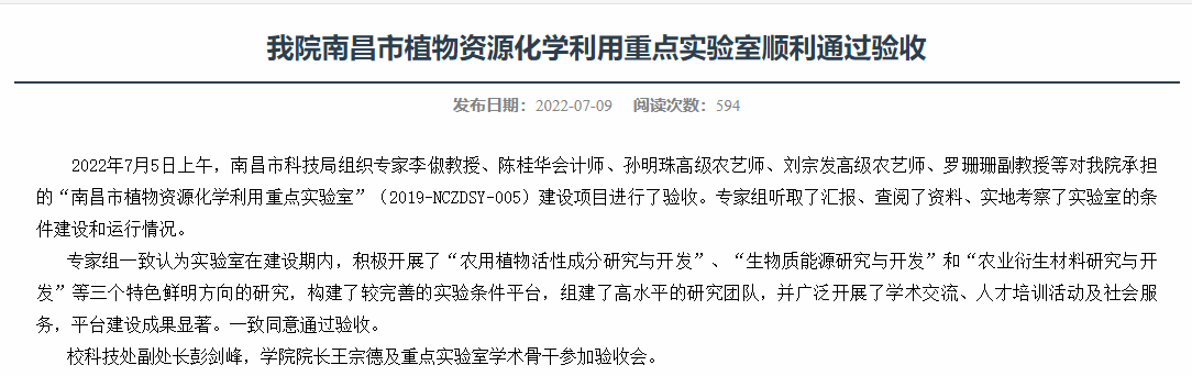 平台建设有实效。基于教学研究型学院定位,学院围绕“建平台、组团队、育成果”的工作思路,于2019年获批南昌市重点实验室1个,实现市级重点实验室零的突破。目前,学院已拥有江西省基础化学实验教学示范中心、南昌市植物资源化学利用重点实验室、南昌市有机功能材料与农业应用优势科技创新团队、6165cc金沙总站功能材料与农业应用化学研究所、5个校外研究生联合培养基地等研究机构,为师生提供了良好的科研平台。