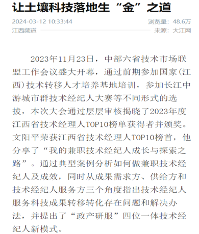3月12日,新华网采访报道了金沙官网兼职技术经纪人文阳平博士的《让土壤科技落地生“金”之道》。报道围绕文阳平博士获江西省技术经理人TOP10榜首,并代表江西在中部六省分享他的“我的兼职技术经纪人成长与探索之路”为核心,报道了文阳平博士兼职技术经纪人成长经历,典型案例分享及成效,土壤科技技术经纪服务,高校、企业和技术经纪人成果转移转化存在的问题和解决办法,最后提出“政产研服”四位一体技术经纪人高级模式,畅通高校科技成果转移转化之路,培育新质生产力,赋能乡村振兴,服务中国经济发展。