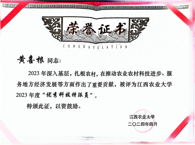 据了解,本次共有20名同志荣获学校2023年度优秀科技特派员称号,金沙官网黄喜根教授名列其中,这也是黄喜根教授连续第七年荣获此殊荣。