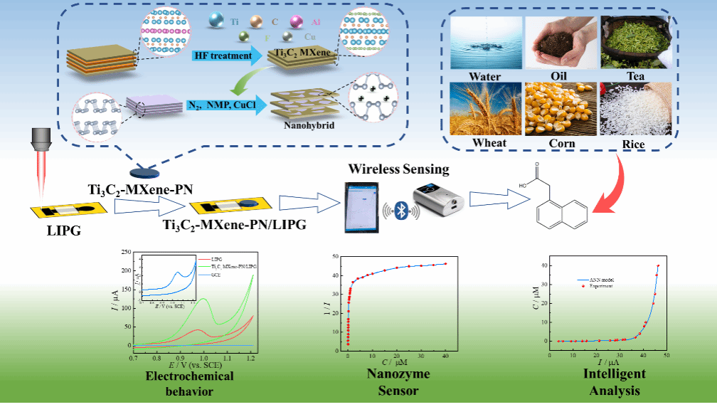 萘乙酸(NAA)是一种萘衍生的植物生长调节剂,与提高农作物中蛋白质和脂肪含量有密切的联系。然而NAA对人体具有潜在危害,甚至一些不法商贩用它来生产无根豆芽。因此开发一种高灵敏、快速、简便、廉价、便携式、无线智能检测新方法实现对农田环境和农产品中NAA痕量快速检测,这对保障农产品和食品安全及环境安全至关重要。在众多传统分析方法中,传感器因其操作简单、成本划算、检测快速、灵敏度高和户外使用等优点而备受青睐。更重要的是,电化学传感器微型化、智能化、无线传输,电极可通过材料表面图案化制备技术轻松获取,无需复杂、繁琐、费时的传统制备工艺。