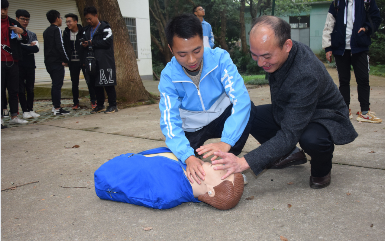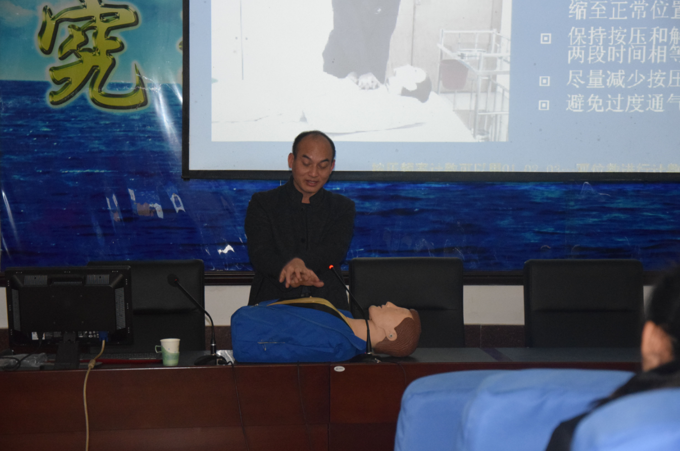 14:00,“心肺复苏”技能普及开始,校医院瞿运秋医生为师生讲解 “心肺复苏”基本知识,现场示范动作要领,指导师生操作练习了“心肺复苏”技能。
