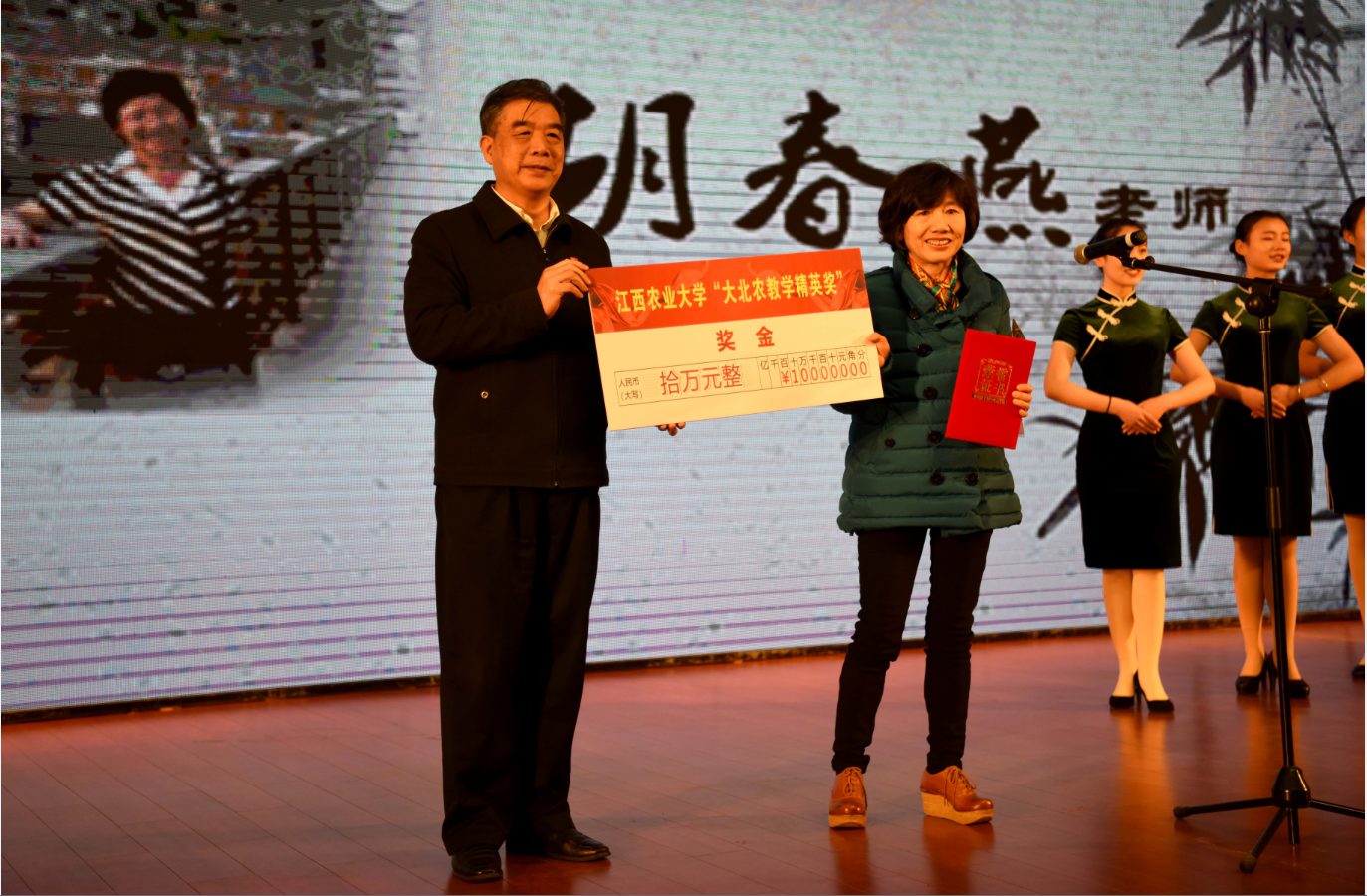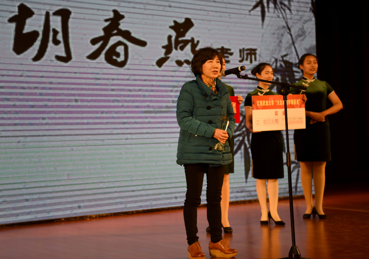 颁奖大会在音乐声中正式开始,校长赵小敏主持,校党委书记黄路生讲话,省教育厅领导、大北农集团总经理分别致辞。接着,揭晓6165cc金沙总站首届“大北农教学精英奖”得主,金沙官网化学系老师胡春燕名列其中。在一片掌声之中,胡春燕老师神采奕奕走向主席台,接过省教育厅领导颁发的证书和奖金。胡老师随后发表获奖感言,她说,荣获得6165cc金沙总站首届“大北农教学精英奖”,感到无比欣慰,这是学校、大北农集团以及老师和学生对他在教学中的付出和表现的一种认可和肯定,也是对所有一直奋战在一线教学岗位的老师们鞭策。她表示她不会满足于已有的成绩和荣誉,会一如既往做到“用心做教育,用爱为人师”,在三尺讲台上继续书写人生。