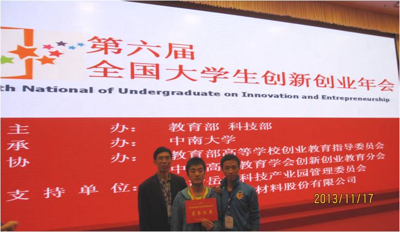 2013年11月15日至17日,第六届全国大学生创新创业年会在湖南长沙中南大学举行。由金沙官网刘光斌老师指导,本科生陈伟等同学完成的学术论文《野生能源物—东京野茉莉制备生物柴油》成功入选入选本次大学生创新学术年会。金沙官网刘光斌老师、校学工处陈家兴老师和2010级陈伟同学代表学校出席大会并做了交流报告。教育部、科技部相关领导出席大会并致辞。