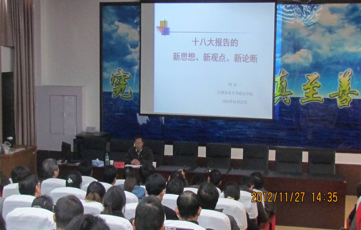 为了切实领会党的十八大精神,掀起学习宣传贯彻十八大精神的热潮,激发全院师生员工的学习工作热情,推进金沙官网工作的科学发展,11月27日下午,学院特邀我校政治学院党总支书记、院长刘汉一教授做专题学习辅导讲座,讲座主题为《十八大报告的新思想、新观点、新论断》,由党委书记彭小波主持。全院120多名师生聆听了讲座内容。