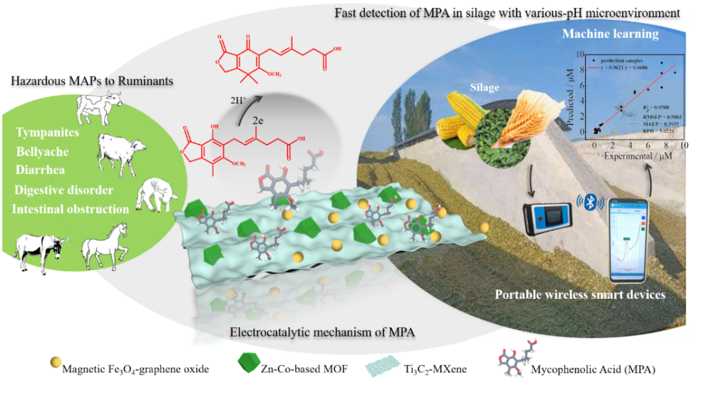 本研究通过密度泛函理论(DFT)和电化学试验研究了MPA的电催化机制,确定其最易发生氧化还原位点。同时结合热点2D纳米材料(MOF和MXene),通过人工神经网络(ANN)算法的机器学习(ML)模型讨论输入pH值实现MPA浓度智能化输出,以适应多变pH微环境,实现对多变pH值微环境下青贮饲料中MPA的智能分析。R2接近1,RMSE和MAE均较低,RPD值较高,表明所提出的ML模型具有良好的预测性能和较高的预测精度。这将为检测各种复杂多变的室外微环境中的有害物质提供一种快速的便携式无线智能传感分析技术。