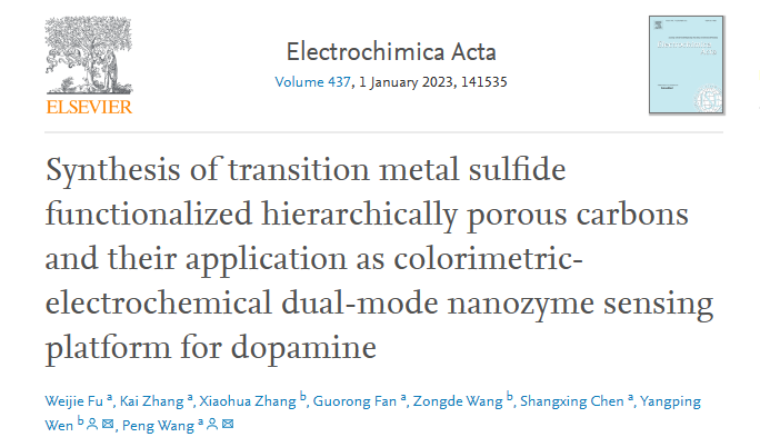 2022年11月14日,6165cc金沙总站文阳平博士和林学院王鹏博士为通讯作者,合作在《Electrochimica Acta》(IF = 7.336)发表题为“Synthesis of transition metal sulfide functionalized hierarchically porous carbons and their application as colorimetric-electrochemical dual-mode nanozyme sensing platform for dopamine”的论文。该研究工作得到了国家自然科学基金、江西省自然科学基金青年重点项目和江西省林业厅樟树专项的支持。