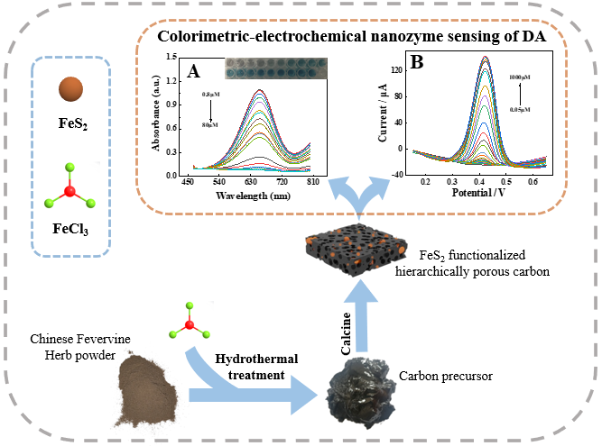 本研究以鸡屎藤为碳源和硫源,不同过渡金属氯化物为金属源,通过水热法制备过渡金属硫化物功能化的生物质多孔碳。筛选出具有优异类过氧化酶和类氧化酶特性的FeS2功能化多孔碳(FSPC),并利用DA对类氧化酶的抑制特性设计了其比色检测,同时将FSPC作为DA的纳米酶电化学传感平台,建立了一种比色-电化学双模式纳米酶传感平台。在实际样品检测中FSPC纳米酶传感器可以实现DA的视觉定性比色检测和定量电化学检测,这为传感检测提供新方法和新思路。