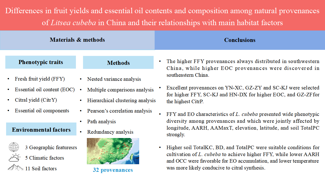 1月21日,国家林草局木本香料(华东)工程技术研究中心、6165cc金沙总站植物天然产物与林产化工研究所的木本香料团队在Industrial Crops and Products期刊(农林类一区Top期刊,IF=6.449)上发表了题为Differences in fruit yields and essential oil contents and composition among natural provenances of Litsea cubeba in China and their relationships with main habitat factors的论文。该研究历经10年在开展全国12省调查和采集了10000多株山苍子,解析了在不同天然种源间山苍子果实产量及精油特性的丰富表型变异特征,高产山苍子主要分布在我国西南地区 (低经度、低纬度与高海拔地区),高精油含量的山苍子主要分布在我国东南地区 (高经度、高纬度与低海拔地区),筛选出多个高产种源、高精油种源和高柠檬醛种源;阐明了影响天然山苍子果实产量及其精油特性的主要环境因素,全面解析了经度、纬度、海拔、年平均相对湿度、年平均最高温度和土壤磷含量是影响山苍子产量和精油特性多样性的最主要环境因素。研究还显示,较高的土壤钾、磷和容重可提高山苍子鲜果产量,而较低的年平均相对湿度和土壤有机质有利于山苍子精油的形成或积累,且较低的温度才更有利于柠檬醛的合成或积累。该研究成果取得了山苍子优良资源筛选方面研究的重要进展,将为我国山苍子良种选育和高效栽培技术提供重要依据。