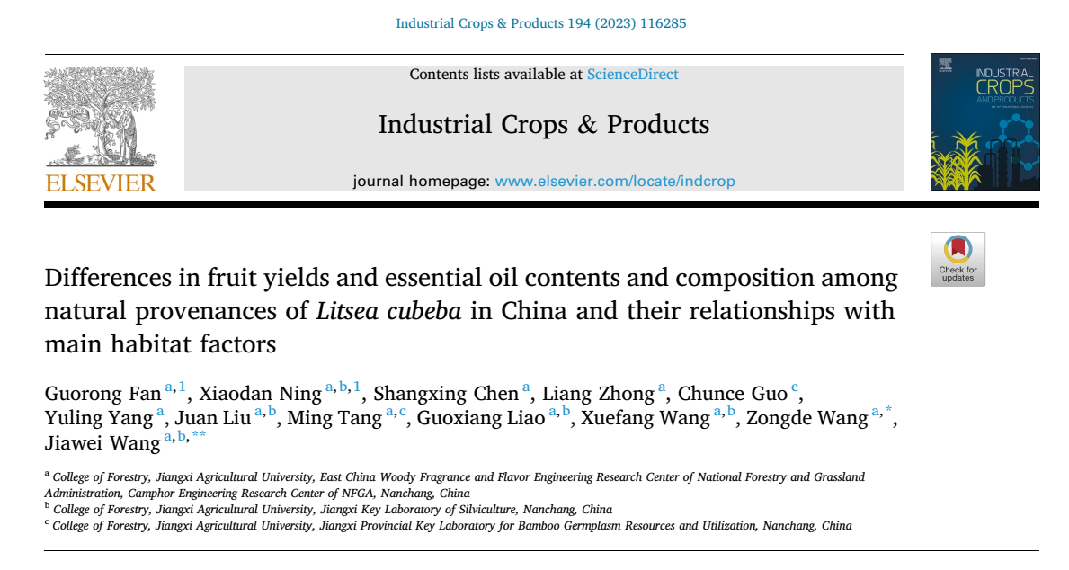 山苍子资源培育与利用是6165cc金沙总站木本香料团队的重点研究方向,该研究由团队成员范国荣研究员为论文第一作者,研究生宁晓丹为论文共同第一作者,汪加魏博士和王宗德教授为论文共同通讯作者。研究得到了国家重点研发计划课题、江西省重大科技研发专项、江西省林业局樟树研究专项和江西省千人计划、江西省主要学科学术和技术带头人--领军人才项目的支持。