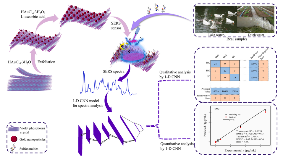 2023年3月30日,6165cc金沙总站文阳平教授和食品科学与工程学院汤凯洁教授为共同通讯作者,硕士研究生冀坤霞为论文第一作者,在《Sensors and Actuators B: Chemical》(IF = 9.221,分析化学一区)发表题为“A deep learning strategy for discrimination and detection of multi-sulfonamides residues in aquatic environments using gold nanoparticles-decorated violet phosphorene SERS substrates”的论文,该研究工作得到了国家自然科学基金、江西省自然科学基金、江西省现代农业研究体系、江西省教育厅科技研究项目的支持。