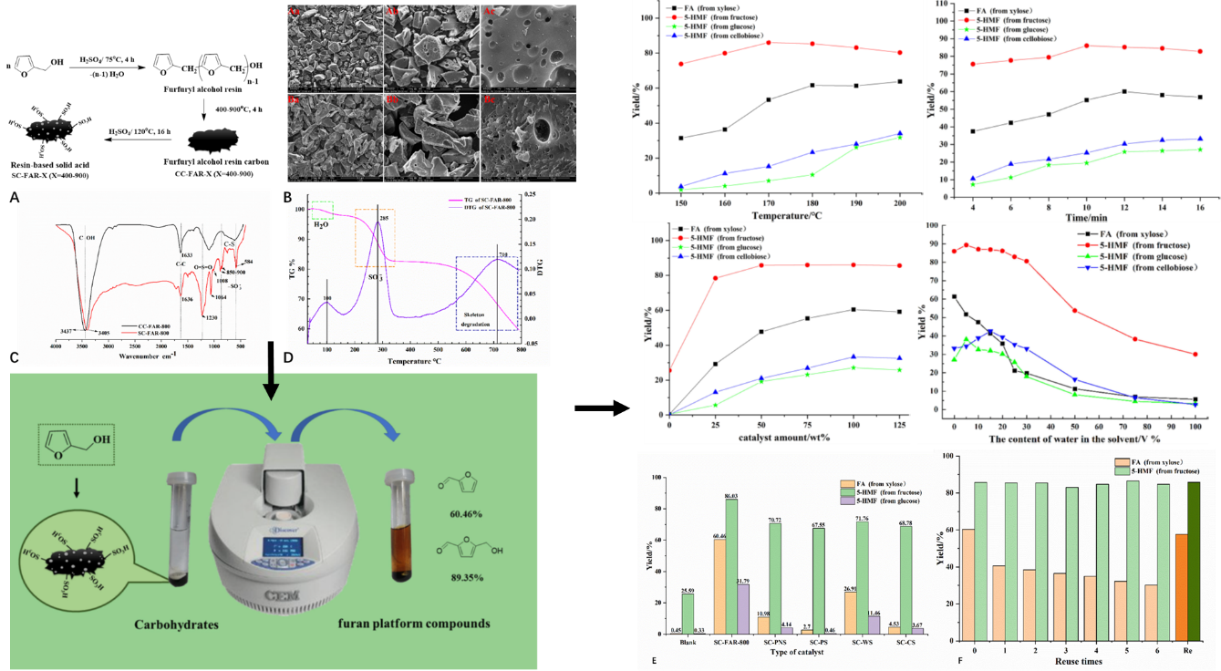 固体酸催化剂,因其制备工艺简单、环境友好、易于分离及可重复回收性能而被广泛研究。该论文以糠醇树脂作为碳源来制备树脂基固体酸,在微波下有效地将碳水化合物转化为呋喃平台化合物(糠醛和5-HMF),测定了该催化剂在不同的反应温度、反应时间、溶剂含水量等影响下催化转化碳水化合物的性能,并将其与生物质基固体酸相对比。此外,还探讨了该催化剂循环利用及再磺化的性能。该项研究为设计与应用制备呋喃平台化合物的功能化催化剂提供了研究思路及可能参考。