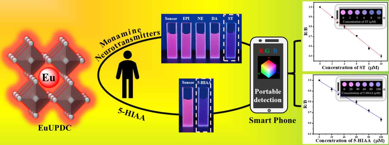 血清素是(ST)中枢神经系统中一种重要的单胺类神经递质。血清素和其主要代谢物5-羟基吲哚-3-乙酸(5-HI-3-AA)被认为是检测类癌的重要生物标志物。因此,血清中ST和尿液中 5-HI-3-AA 的定量检测对于医学早期诊断类癌具有重要的意义。该论文设计合成了一种高效发光稀土铕金属有机框架材料(Eu-MOF)荧光探针。该探针在所有单胺类神经递质中能够特异性识别ST,具有优异的选择性,且灵敏度比已报道的荧光探针提高了近10倍。此外,该探针可实际应用于定量检测人血清和尿液样本中的ST和5-HI-3-AA。
