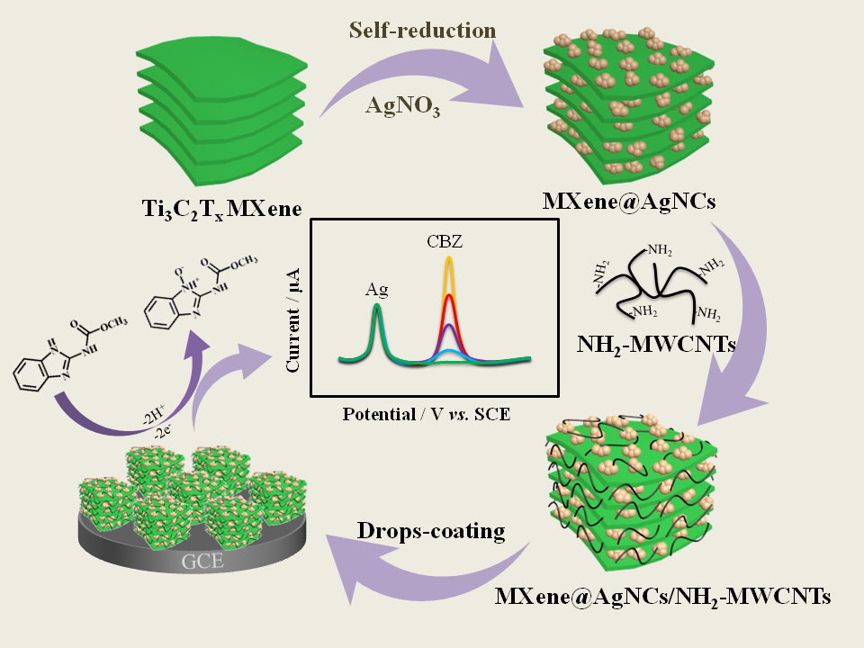 金属Ag纳米簇(AgNCs)不仅能提供稳定的电化学信号,而且能增强对分析物的电催化活性,是比率型电化学传感器理想的内部参考信号。基于此,该论文中利用Mxene自还原反应制备可调层状MXene@AgNCs,再结合高催化活性的NH2-MWCNTs构建了一种新颖的比率型电化学传感器,实现了蔬菜中残留多菌灵的高灵敏检测。
