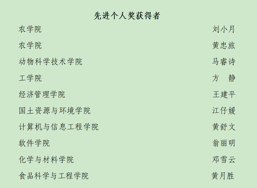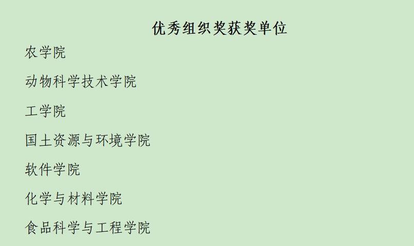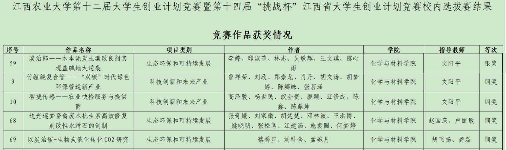 9月3日,第十二届大学生创业计划竞赛暨第十四届“挑战杯”江西省大学生创业计划竞赛校内选拔赛圆满落幕。金沙官网《炭治郎——木本泥炭土壤改良剂实现盐碱地大逆袭》(指导老师:文阳平,团员成员:李婷、邱淑菲、林志、吴敏辉、王文琪、陈心雨)获银奖;《竹缠绕复合管——“双碳”时代绿色环保管道新产业》(指导老师:文阳平,团员成员:曾祥荣、刘欣、郑崇龙、肖丹、胡文涛、胡梦婷、陈娜妹、张茗涵)和《智捷传感——农业快检服务与提供商》(指导老师:文阳平,团员成员:高泽骏、杨世民、蚁金贵、廖颖、江修成、陈鑫、陈鼎坤)获铜奖;《追光逐梦畜禽废水抗生素高效修复剂改性水滑石的创制》(指导老师:赵国庆、卢丽敏,团员成员:张奇娥、刘家微、胡楚楚、邓林波、王洪博、姚晓明、张松阅、江建滔、施袁圆、何梦婷)和《以炭治碳-生物炭催化转化CO2研究》(指导老师:胡飞扬、龚磊,团员成员:蔡秀星、刘科含、孟碗月)获铜奖。此外,金沙官网获优秀组织奖,学工办邓雪云老师获大赛组织先进个人奖。